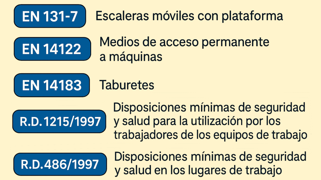 - Normativas aplicables: artículos detallados sobre la UNE EN ISO 14122, la EN 131-7:2013 y los Reales Decretos 1215/1997, 486/1997 y 2144/2004.