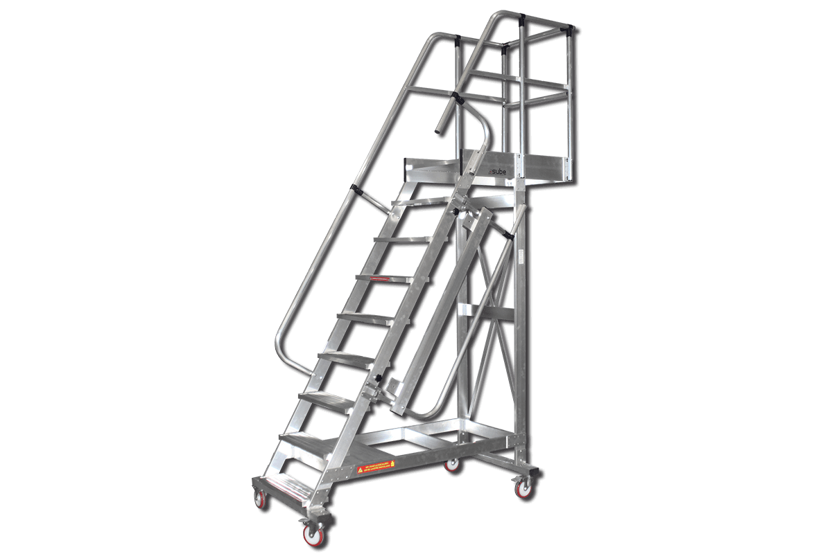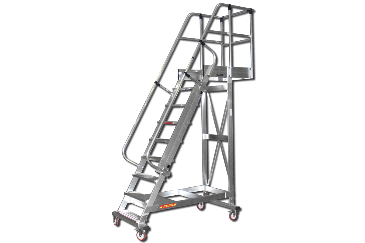 Escalera móvil con plataforma, fabricada en aluminio y conforme a la normativa europea EN 131-7.