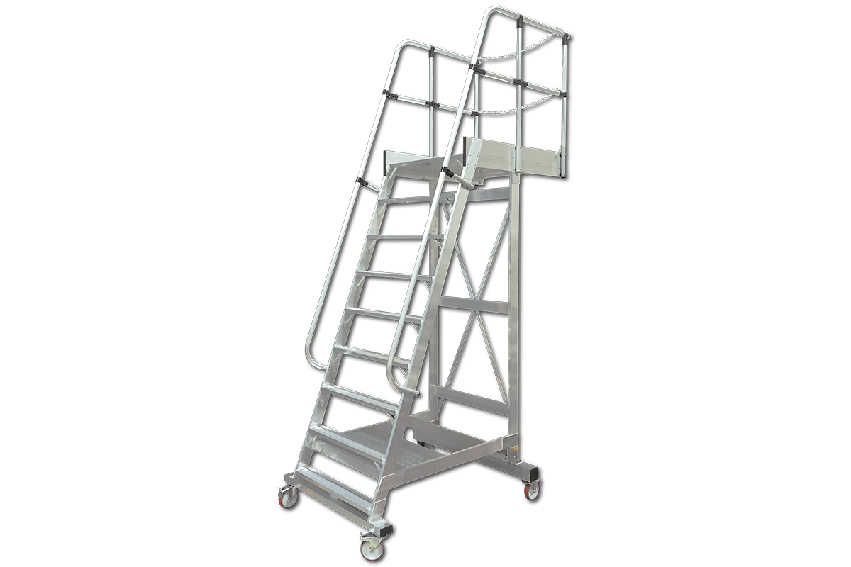 Escalera móvil con plataforma, fabricada en aluminio y conforme a la normativa europea EN 131-7.